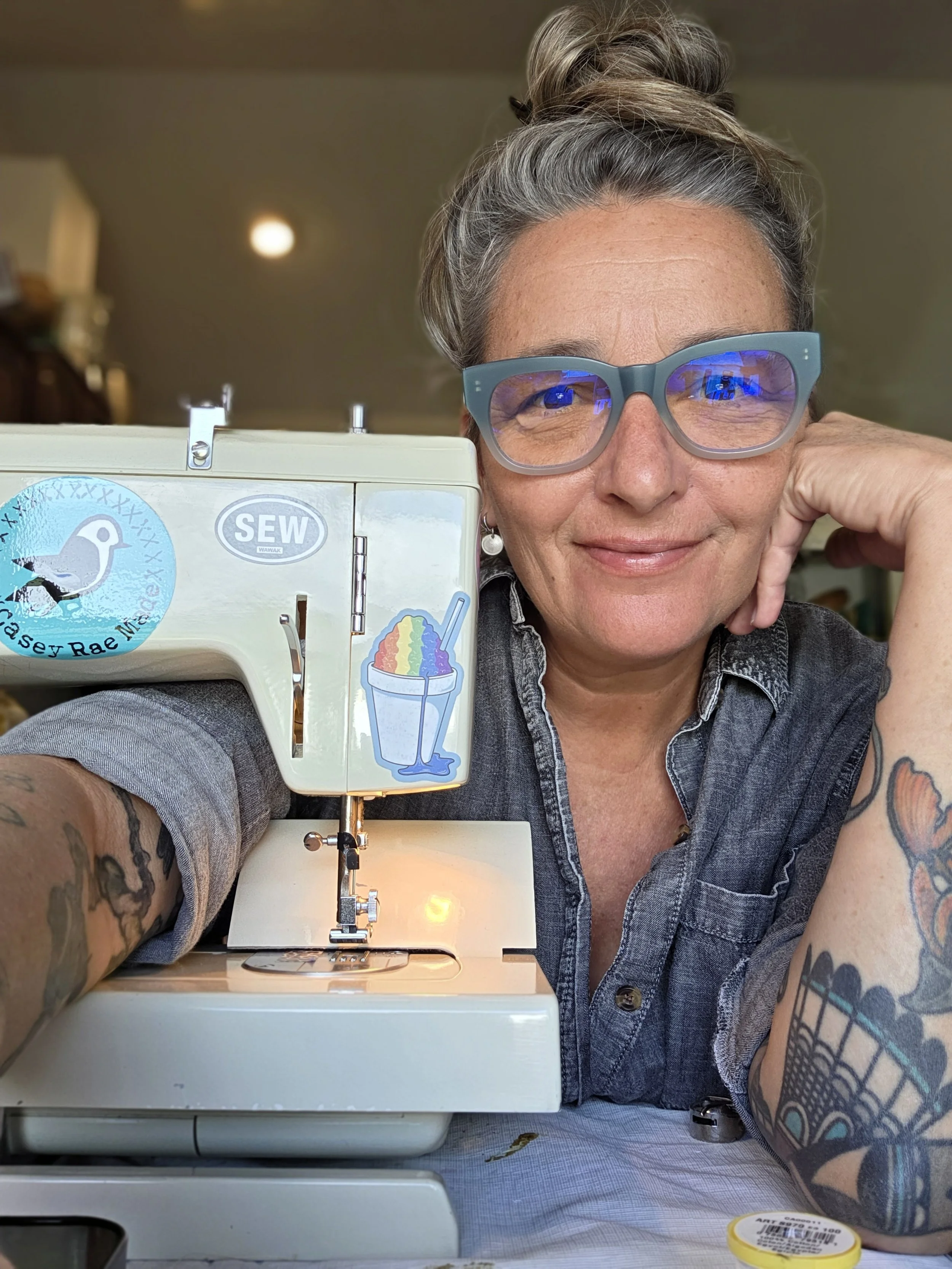 Casey Rae Made practices sustainability at every turn. All textiles used are thrifted or gifted, and leftover scraps are saved for future projects. Mailers are made with plant-based materials and are compostable, and the majority of my equipment is second hand.